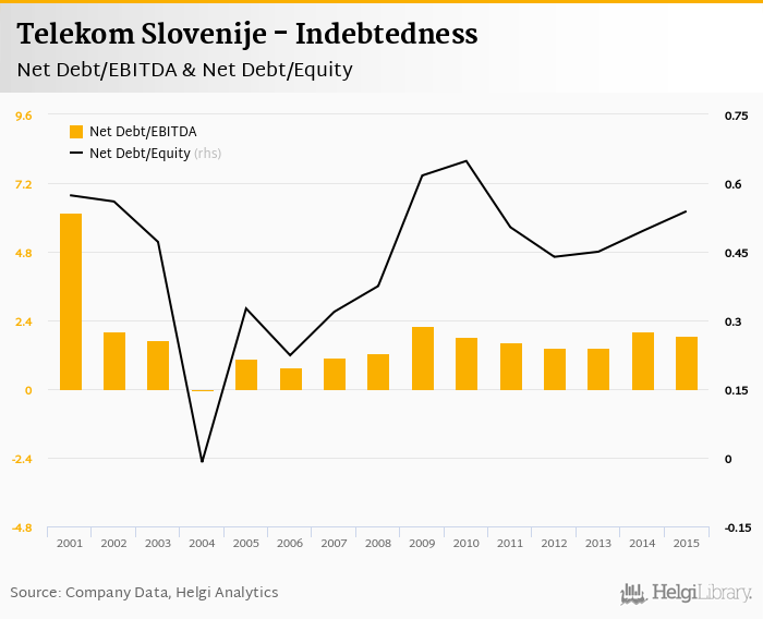 Telekom Slovenije's net debt stood at EUR 376 mil and accounted for 0.539 of equity at the end of 2015. The ratio is up 0.043 pp compared to the previous year.