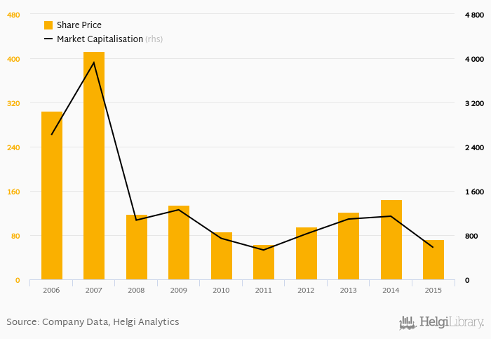 Since the end of 2010, stock has appreciated by -15.1% implying an annual average growth of -3.22% In absolute terms, the value of the company fell by USD 167 mil.