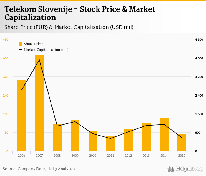 Telekom Slovenije stock traded at EUR 73.0 per share at the end 2015 implying a market capitalization of USD 575 mil.