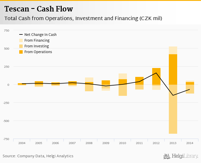 Cash from financing amounted to CZK 20.2 mil, so the company generated CZK -68.9 mil net cash in 2014.