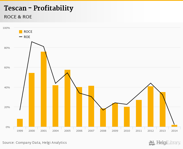 As far as Tescan's peers are concerned, Varroc Lighting Systems Czech Republic generated ROE of 39.2% and ROCE of 30.7% in 2014. Automotive Lighting's profitability reached 43.1% and 35.9%, respectively. Continental Automotive Czech Republic operated with 17.7% and 4.79% returns in 2014.
