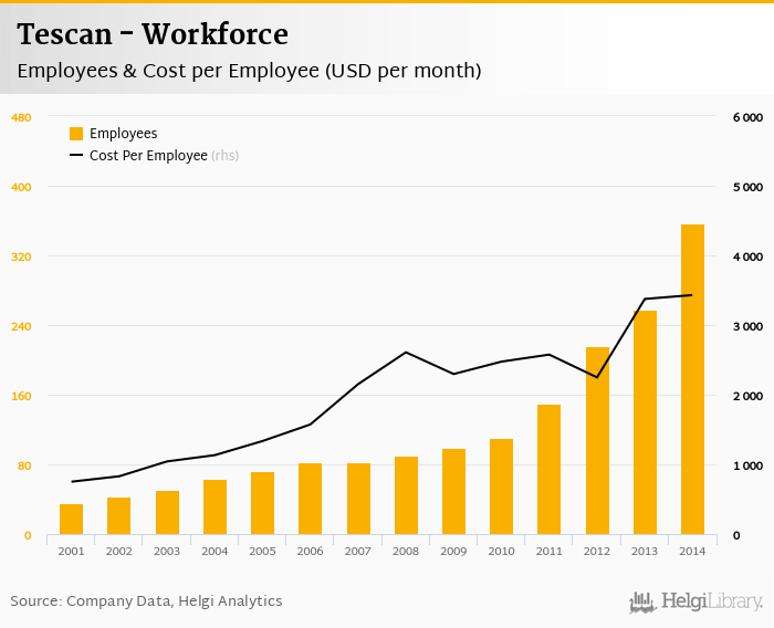 Tescan employed 357 employees in 2014, up 38.4% compared to the previous year. Historically, between 2001 and 2014, the firm's workforce hit a high of 357 employees in 2014 and a low of 35.0 employees in 2001.