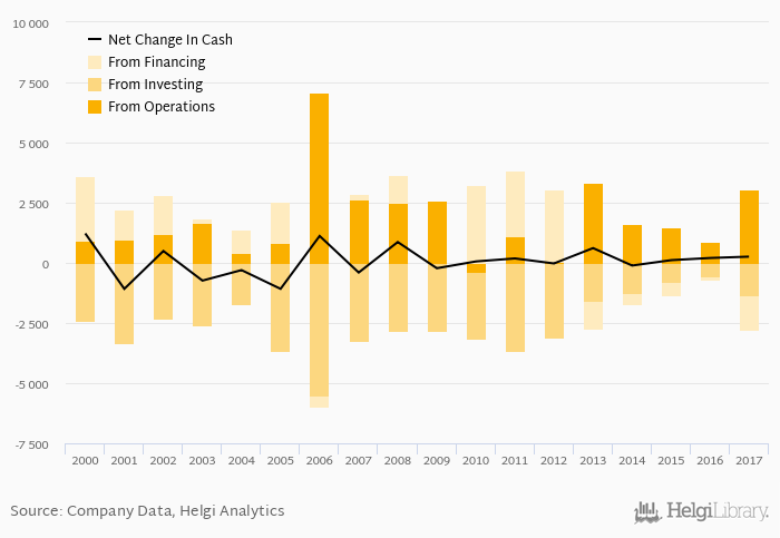 Cash from financing amounted to CZK -1,456 mil, so the company generated CZK 259 mil net cash in 2017.