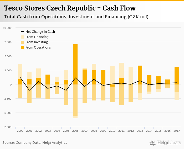 Tesco Stores Czech Republic's operating cash flow stood at CZK 3,051 mil in 2017, up 242% when compared to the previous year. Historically, between 2000 - 2017, the firm’s operating cash flow reached a high of CZK 7,089 mil in 2006 and a low of CZK -369 mil in 2010.