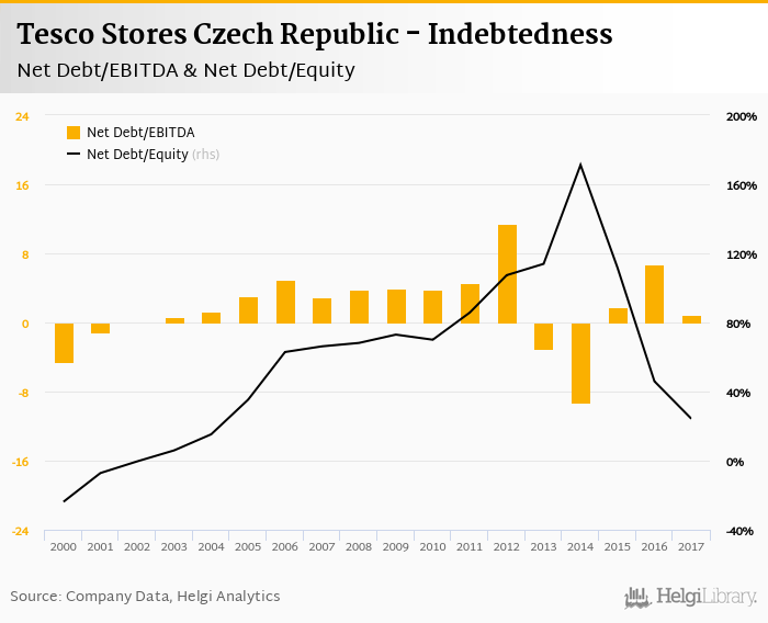 Tesco Stores Czech Republic's net debt stood at CZK 3,486 mil and accounted for 24.3% of equity at the end of 2017. The ratio is down 21.7 pp compared to the previous year.
