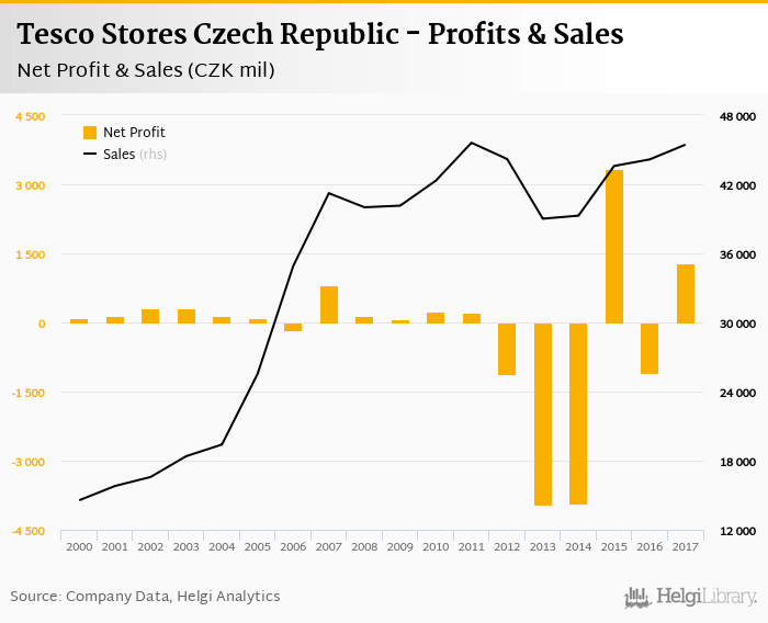 Tesco Stores Czech Republic made a net profit of CZK 1,278 mil in 2017, up 217% compared to the previous year. Total sales reached CZK 45,440 mil, which is up 2.9% when compared to the previous year.