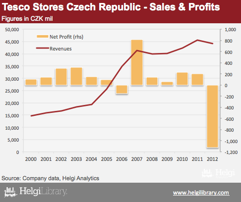 Tesco Stores Czech Republic is a Czech subsidiary of a British multinational grocery and general merchandise retailer Tesco Plc. Tesco entered the Czech market in 1996. In 2006, it took over all the hypermarkets operated by Carrefour. In the last decade, the Company has increased its sales 2.7-times on the Czech market to more than USD 2 bil. In the first time since 1996, Tesco has however shown a deep loss exceeding USD 50 mil (or CZK 1,123 mil).