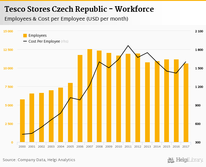 Tesco Stores Czech Republic employed 10,633 employees in 2017, down 5.15% compared to the previous year. Historically, between 2000 and 2017, the firm's workforce hit a high of 12,562 employees in 2007 and a low of 5,795 employees in 2000.