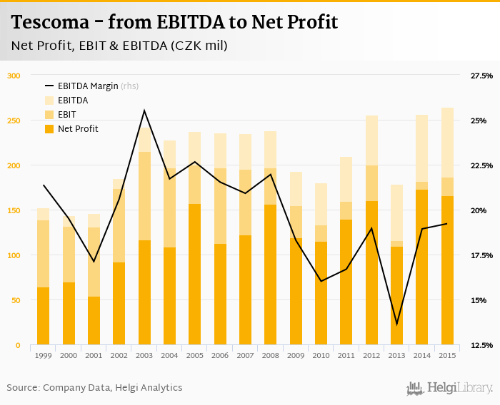Tescoma made a net profit of CZK 166 mil with revenues of CZK 1,376 mil in 2015, down by 4.21% and up by 1.72%, respectively, compared to the previous year. This translates into a net margin of 12.1%.