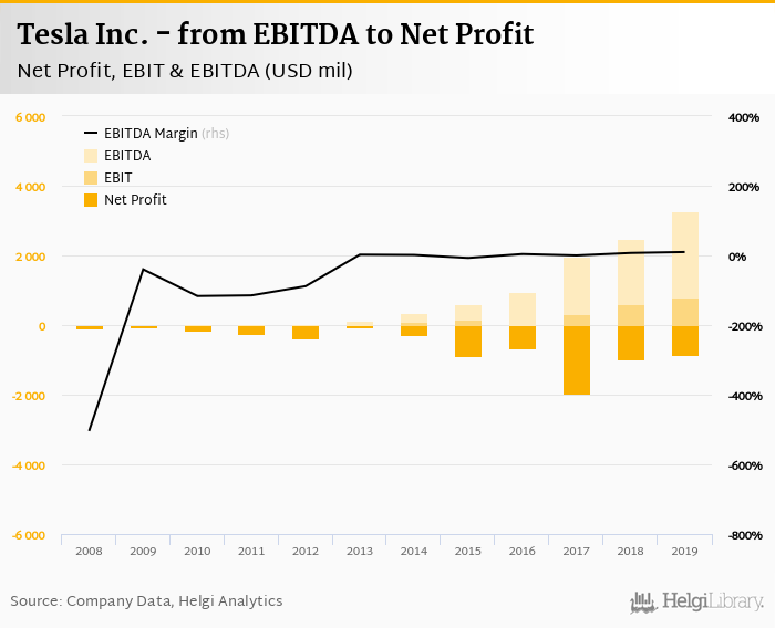Tesla Inc. made a net profit of USD -862 mil with revenues of USD 24,578 mil in 2019, up by 11.6% and up by 14.5%, respectively, compared to the previous year. This translates into a net margin of -3.51%.