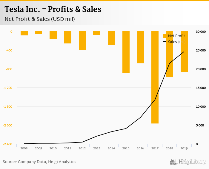Tesla Inc. made a net profit of USD -862 mil in 2019, up 11.6% compared to the previous year. Total sales reached USD 24,578 mil, which is up 14.5% when compared to the previous year.
