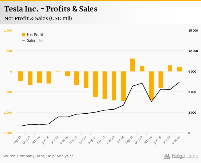 Tesla Inc. made a net profit of USD 105 mil in 4Q2019, down 24.5% compared to the previous year. Total sales reached USD 7,384 mil, which is up 2.19% when compared to the previous year.