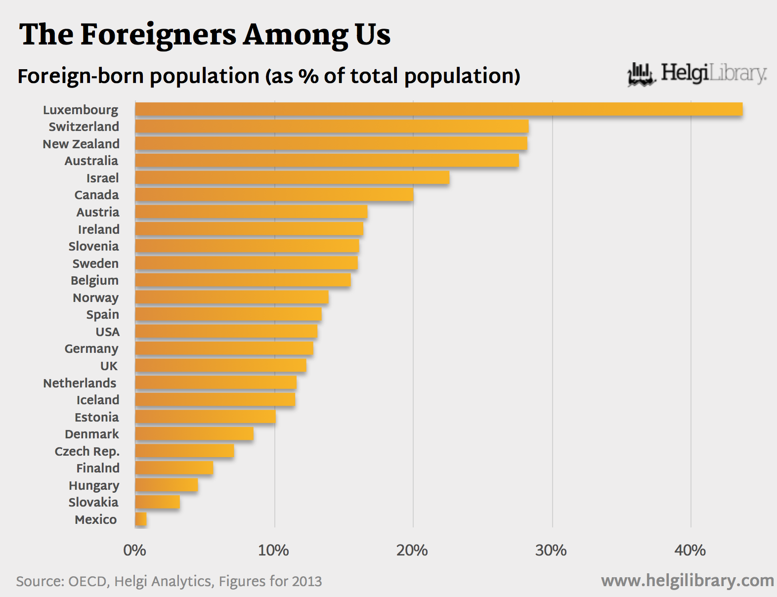 The largest foreign-born population in the world is in the United States, which according to Pew Research Center was home to 41 million foreign-residents in 2013, or 13.1% of the population.