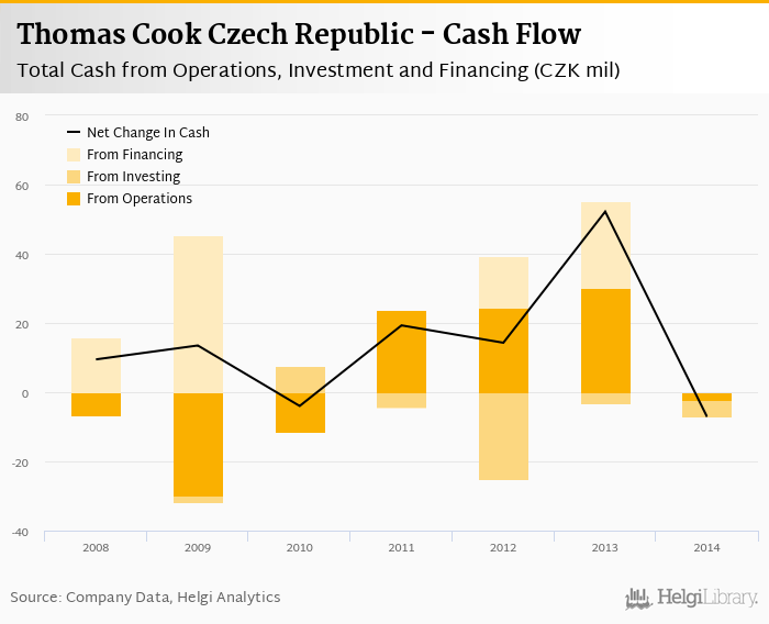 Thomas Cook Czech Republic's operating cash flow stood at CZK -2.11 mil in 2014, down 107% when compared to the previous year. Historically, between 2008 - 2014, the firm’s operating cash flow reached a high of CZK 30.3 mil in 2013 and a low of CZK -29.8 mil in 2009.