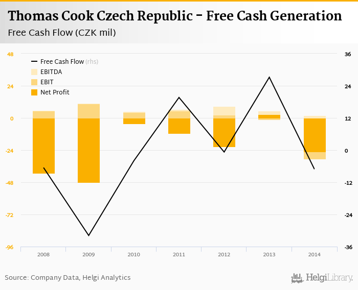 Thomas Cook Czech Republic made a net profit of CZK -25.1 mil with revenues of CZK 684 mil in 2014, down by 1% and up by 4.04%, respectively, compared to the previous year. This translates into a net margin of -3.67%.