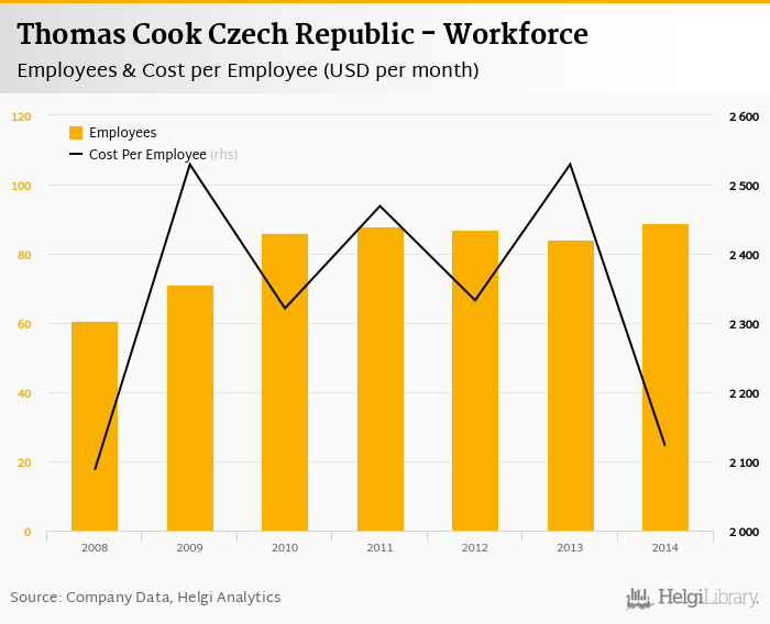 Thomas Cook Czech Republic employed 89.0 employees in 2014, up 5.95% compared to the previous year. Historically, between 2008 and 2014, the firm's workforce hit a high of 89.0 employees in 2014 and a low of 60.6 employees in 2008.