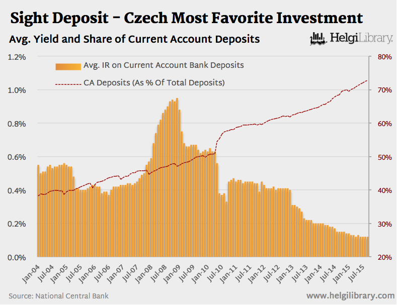According to OECD, retail deposits formed nearly 72% of households' financial assets at the end of 2012 in the Czech Republic, a very high figure compared to most of the developed world. In other words, Czechs held almost half of all their financial savings in current accounts in banks.