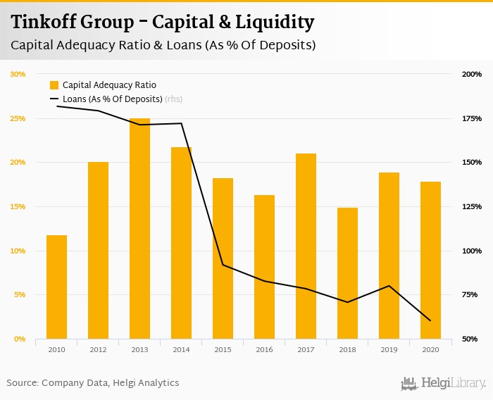 Tinkoff Group's capital adequacy ratio reached 17.9% at the end of 2020, down from 18.9% compared to the previous year. Historically, the bank’s capital ratio hit an all time high of 25.0% in 2013 and an all time low of 11.8% in 2010.