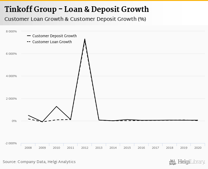 Tinkoff Group's customer loan growth reached 14.4% in 2020, down from 65.8% compared to the previous year. Historically, the bank’s loans growth reached an all time high of 7,147% in 2012 and an all time low of -95.9% in 2009. In the last decade, the average annual loan growth amounted to 103%.
