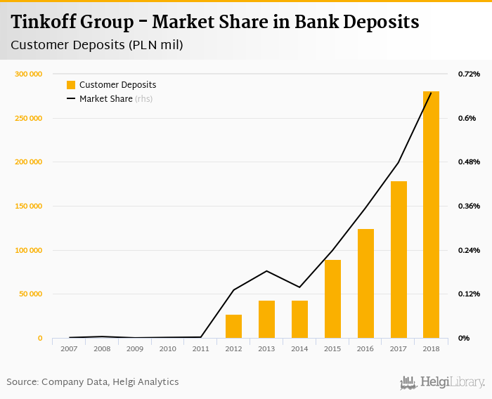 Tinkoff Group's customer deposits reached PLN 280,916 mil in 2018, up 56.9% compared to the previous year.