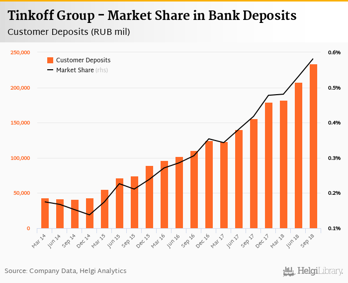 Tinkoff Group's customer deposits reached RUB 233,543 mil in 2018-09-30, up 12.5% compared to the previous year.