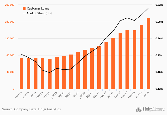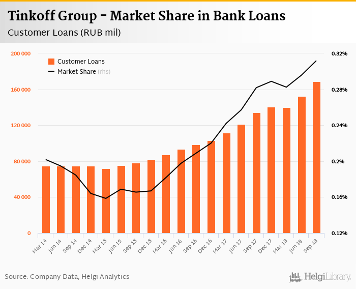 Tinkoff Group's customer loans reached RUB 168,670 mil in 2018-09-30, up 10.8% compared to the previous year.