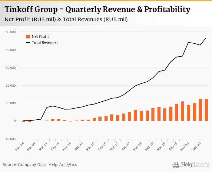Tinkoff Group made a net profit of RUB 12,332 mil under revenues of RUB 46,554 mil in the fourth quarter of 2020, up 12.1% and 28.1% respectively when compared to the same period last year.