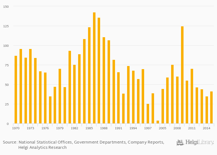 Historically, titanium minerals production in Sri Lanka reached an all time high of 142 kt in 1986 and an all time low of 4.13 kt in 2004.