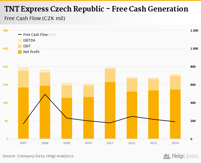 TNT Express Czech Republic made a net profit of CZK 219 mil with revenues of CZK 2,482 mil in 2014, up by 2.31% and up by 30.7%, respectively, compared to the previous year. This translates into a net margin of 8.83%.