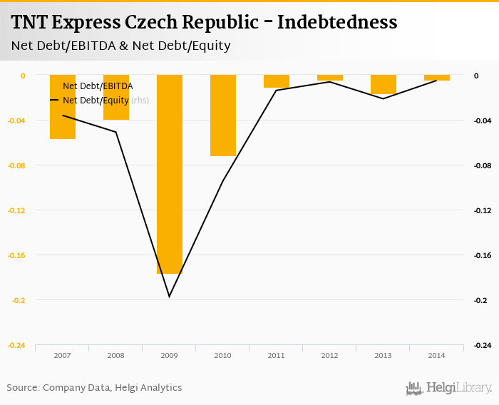 TNT Express Czech Republic's net debt stood at CZK -1.22 mil and accounted for -0.005 of equity at the end of 2014. The ratio is up 0.016 pp compared to the previous year.