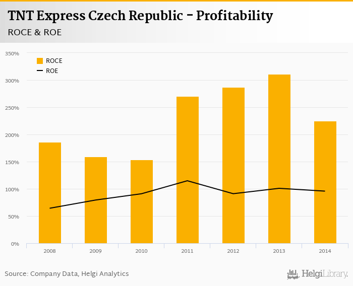 As far as TNT Express Czech Republic's peers are concerned, Geis Parcel Czech Republic generated ROE of 24.8% and ROCE of 32.5% in 2014. PPL Czech Republic's profitability reached 23.0% and 26.1%, respectively. DHL Express Czech Republic operated with 19.2% and 18.4% returns in 2014.