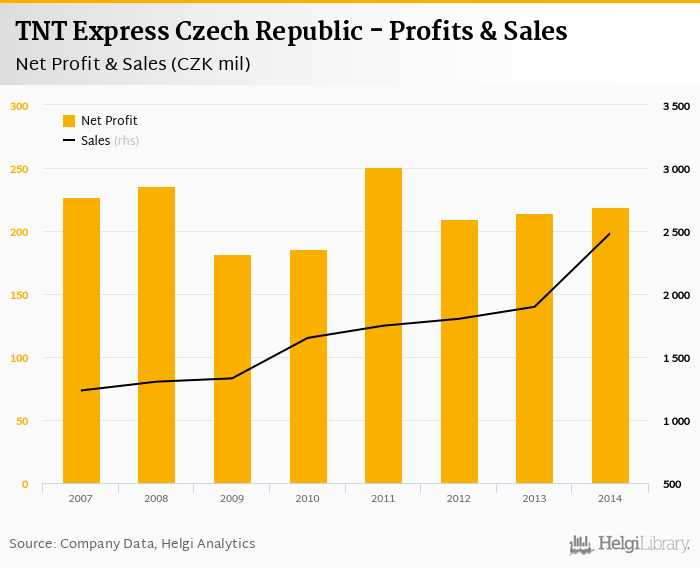 TNT Express Czech Republic made a net profit of CZK 219 mil in 2014, up 2.31% compared to the previous year. Total sales reached CZK 2,482 mil, which is up 30.7% when compared to the previous year.