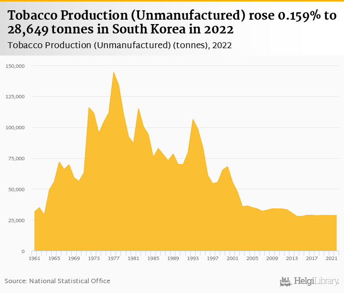 Unmanufactured tobacco production rose 0.159% to 28,649 tonnes in South Korea in 2022, according to the National Statistical Office.
