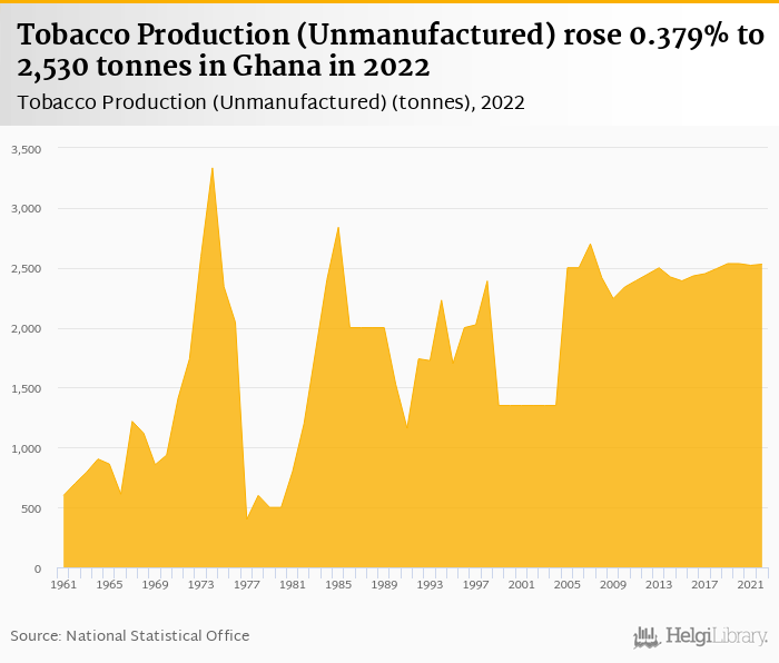 Unmanufactured tobacco production rose 0.379% to 2,530 tonnes in Ghana in 2022, according to the National Statistical Office.