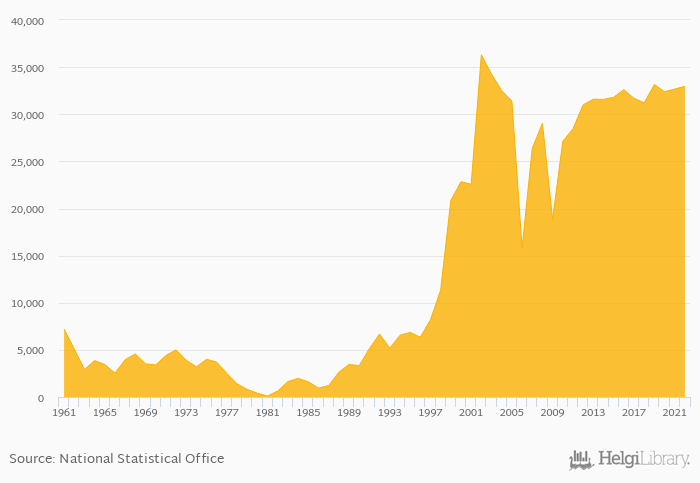 Historically, unmanufactured tobacco production in Uganda reached an all time high of 36,310 tonnes in 2002 and an all time low of 100 tonnes in 1981.