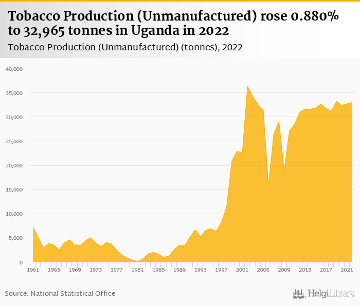 Unmanufactured tobacco production rose 0.880% to 32,965 tonnes in Uganda in 2022, according to the National Statistical Office.