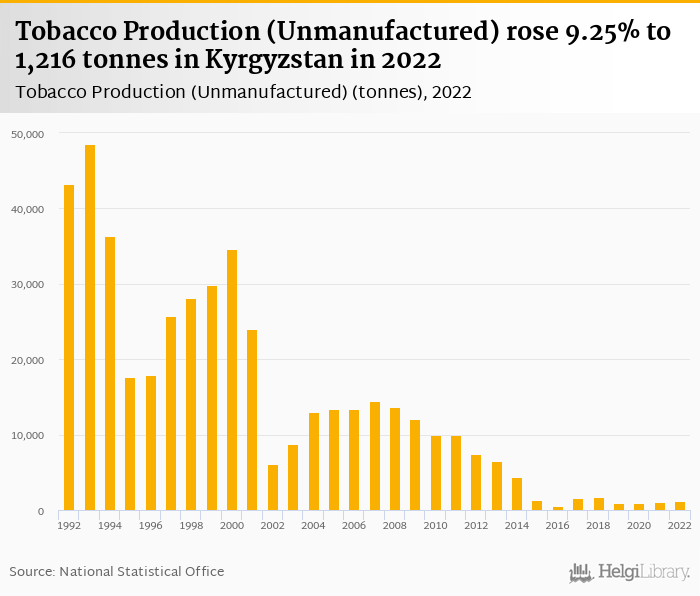 Unmanufactured tobacco production rose 9.25% to 1,216 tonnes in Kyrgyzstan in 2022, according to the National Statistical Office.