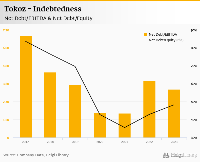 Tokoz's net debt stood at CZK 132 mil and accounted for 48.3% of equity at the end of 2023. The ratio is up 5.38 pp compared to the previous year.