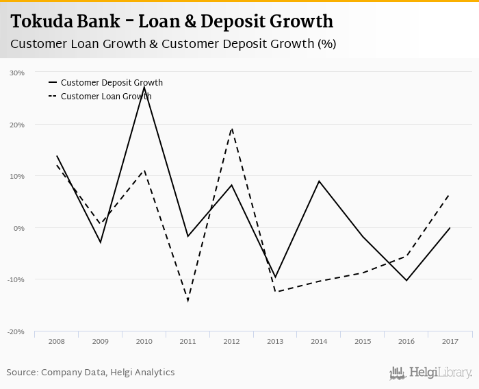 Tokuda Bank's customer loan growth reached 6.63% in 2017, up from -5.59% compared to the previous year. Historically, the bank’s loans growth reached an all time high of 19.3% in 2012 and an all time low of -14.1% in 2011. In the last decade, the average annual loan growth amounted to 0%.