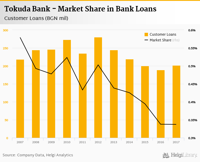 Tokuda Bank accounted for 0.337% of all customer loans issued in Bulgaria at the end of 2017. Historically, the bank’s market share in customer loans reached an all time high of 0.579% in 2007 and an all time low of 0.337% in 2017.