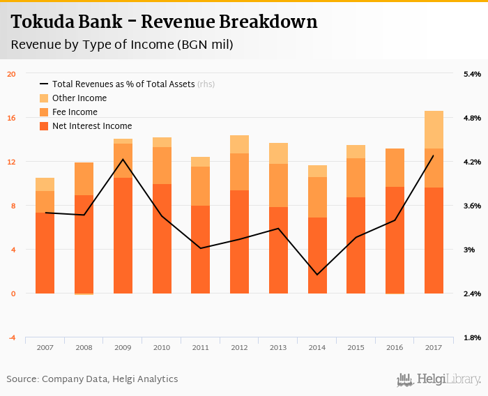 Comparing Tokuda Bank with its closest peers, DSK Bank generated total revenues of 5.78% of assets in 2017, United Bulgarian Bank operated with 4.70% revenue margin and Raiffeisenbank Bulgaria produced total income worth 4.37% of assets.