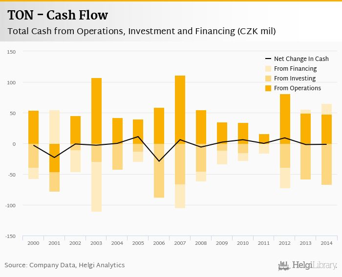 TON's operating cash flow stood at CZK 47.3 mil in 2014, down 4.26% when compared to the previous year. Historically, between 2000 - 2014, the firm’s operating cash flow reached a high of CZK 111 mil in 2007 and a low of CZK -46.0 mil in 2001.