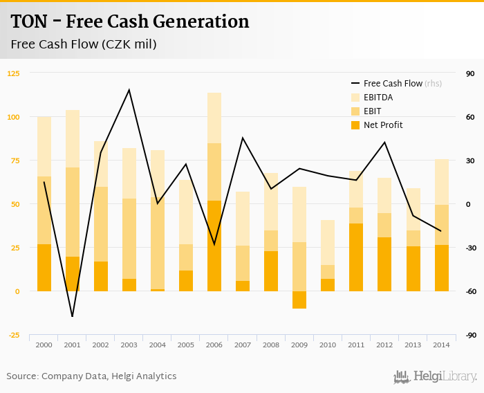 TON made a net profit of CZK 26.4 mil with revenues of CZK 767 mil in 2014, up by 2.49% and up by 3.45%, respectively, compared to the previous year. This translates into a net margin of 3.44%.