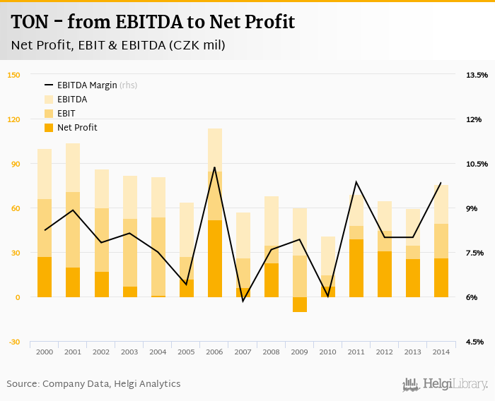 TON made a net profit of CZK 26.4 mil with revenues of CZK 767 mil in 2014, up by 2.49% and up by 3.45%, respectively, compared to the previous year. This translates into a net margin of 3.44%.