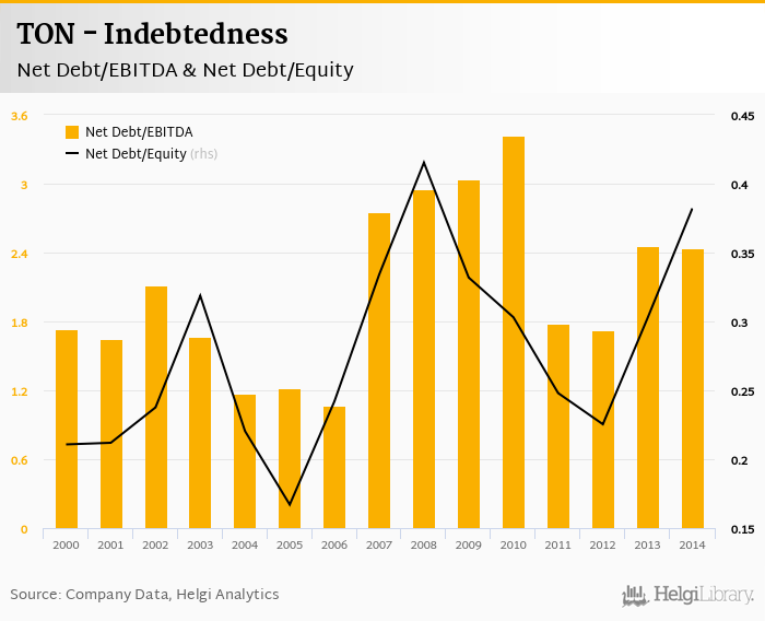 TON's net debt stood at CZK 185 mil and accounted for 0.382 of equity at the end of 2014. The ratio is up 0.080 pp compared to the previous year.