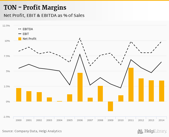 TON made a net profit of CZK 26.4 mil with revenues of CZK 767 mil in 2014, up by 2.49% and up by 3.45%, respectively, compared to the previous year.