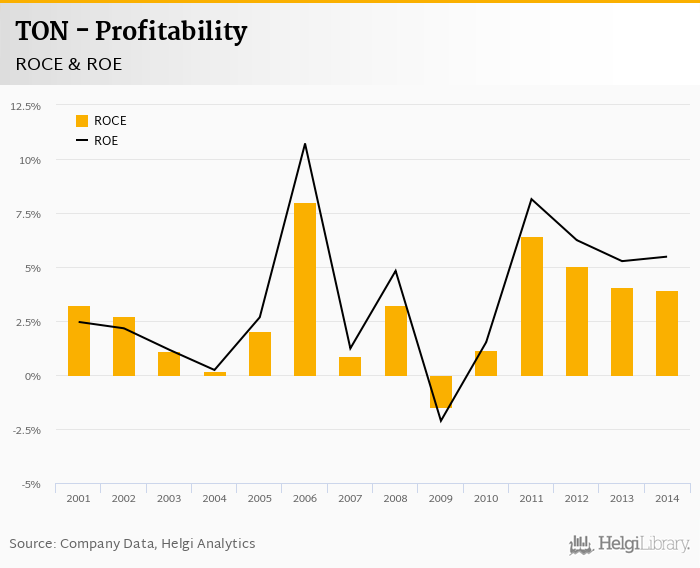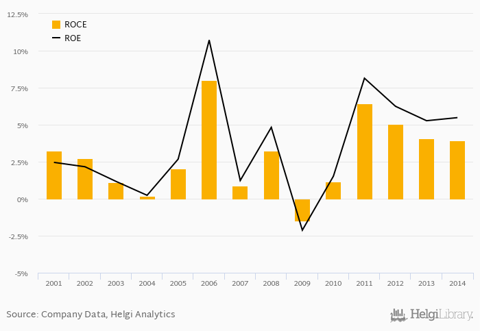 The result implies a return on equity of 5.48% and a return on invested capital of 3.95% in 2014. That is compared to an average of 5.33% and 4.13% over the last five years.