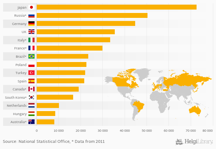 | Japan | 65,608 | 66,849 | 67,583 | 69,813 | 70,293 | |||||||||||||||||