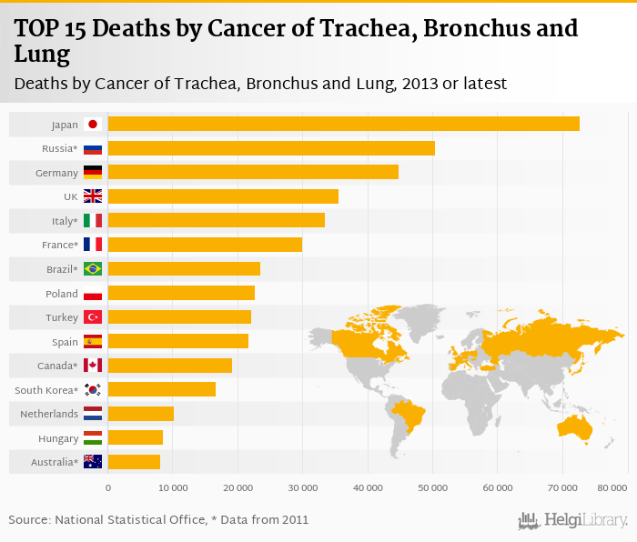 Based on a comparison of 36 countries in 2013, Japan ranked the highest in deaths by cancer of trachea, bronchus and lung with 72,734 followed by Russia and Germany. On the other end of the scale was Luxembourg with 196, Costa Rica with 288 and Estonia with 688.