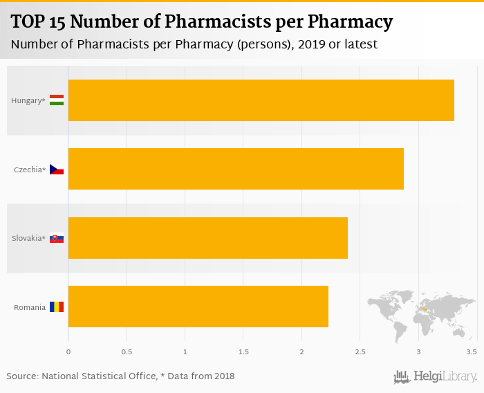 Based on a comparison of 32 countries in 2014, Austria ranked the highest in number of pharmacists per pharmacy with 4.22 persons followed by Slovenia and Switzerland. On the other end of the scale was Turkey with 1.00 persons, Sweden with 1.04 persons and Cyprus with 1.05 persons.
